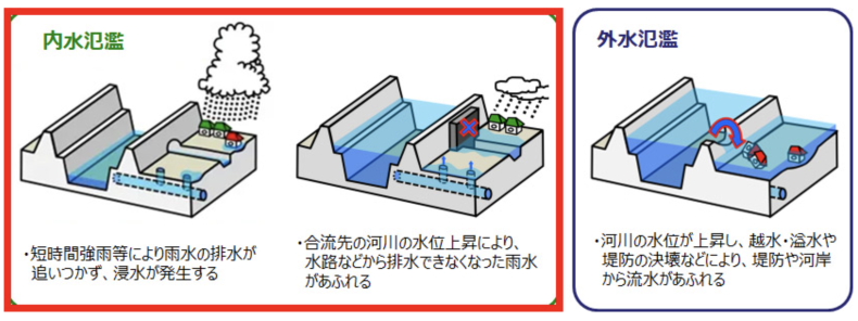 水害というと「洪水(外水氾濫)」を思い浮かべる方も多いでしょうが、近年増えている被害は「内水氾濫」によるものです。内水氾濫とは、短時間の豪雨などにより雨水の排水が追いつかなくなったり、合流先の河川の水位上昇により排水ができなくなったりすることで浸水する事象を指します。